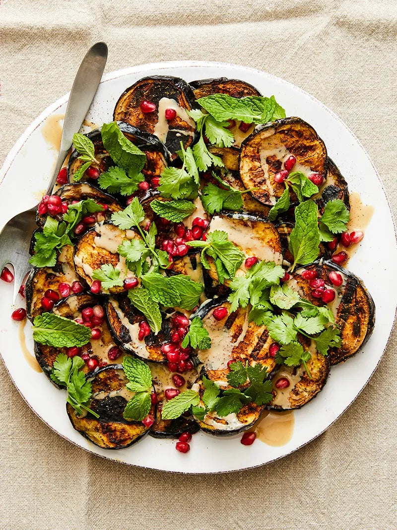 Drizzle roast eggplant with tahini and olive oil, pomegranate seeds, ground pepper and mint.