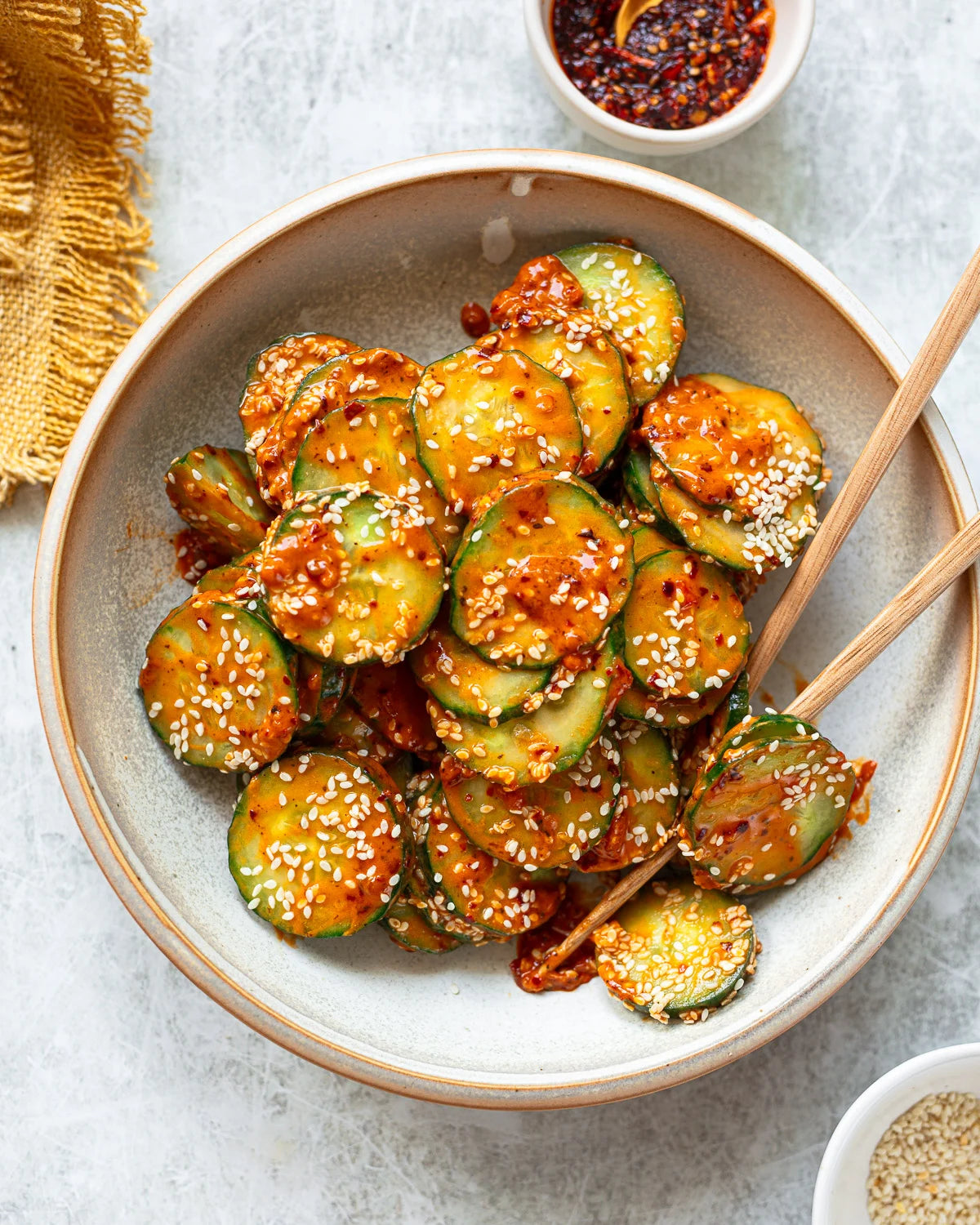 Coat cucumber in an mix of chili crisp, peanut butter, garlic, soy, and sesame seeds