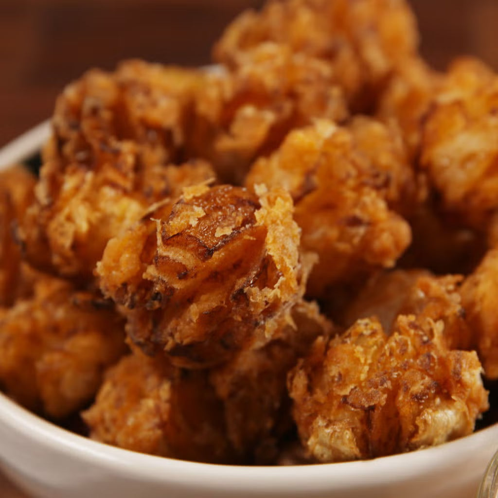 Cut a large sweet onion into the shape of a flower, soak it in a buttermilk-and-egg mix, then seasoned flour, and then air-fry it until it's crispy and golden brown.