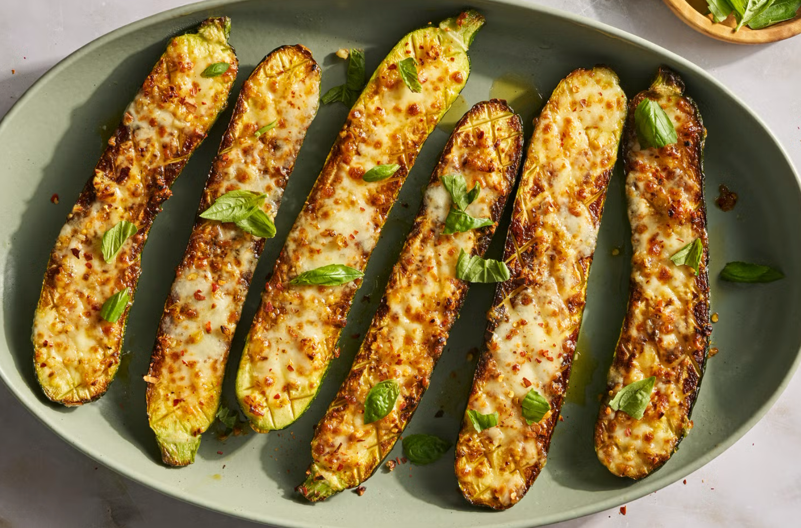 Slather cut zucchini with garlic oil and showered with mozzarella and Parmesan, and bake